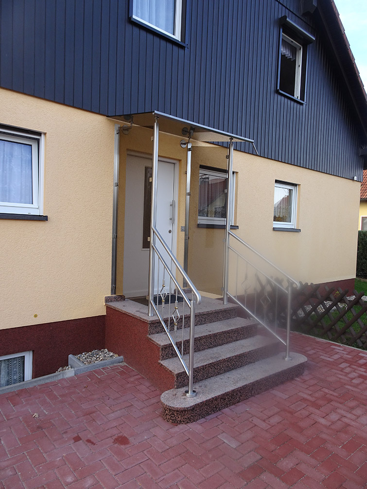 Schützen Sie sich und Ihre Haustür vor Wind und Wetter mit unseren exklusiven Vordächern aus Edelstahl und Verbundsicherheitsglas. Einladende Optik mit transparentem Schutz, passend für jeden Baustil. Ebenso optimal als Sicht und Regenschutz für Balkon und Terrasse geeignet. Die eingesetzten Materialien gewährleisten auch hier eine hervorragende Witterungsbeständigkeit und lange Lebensdauer.